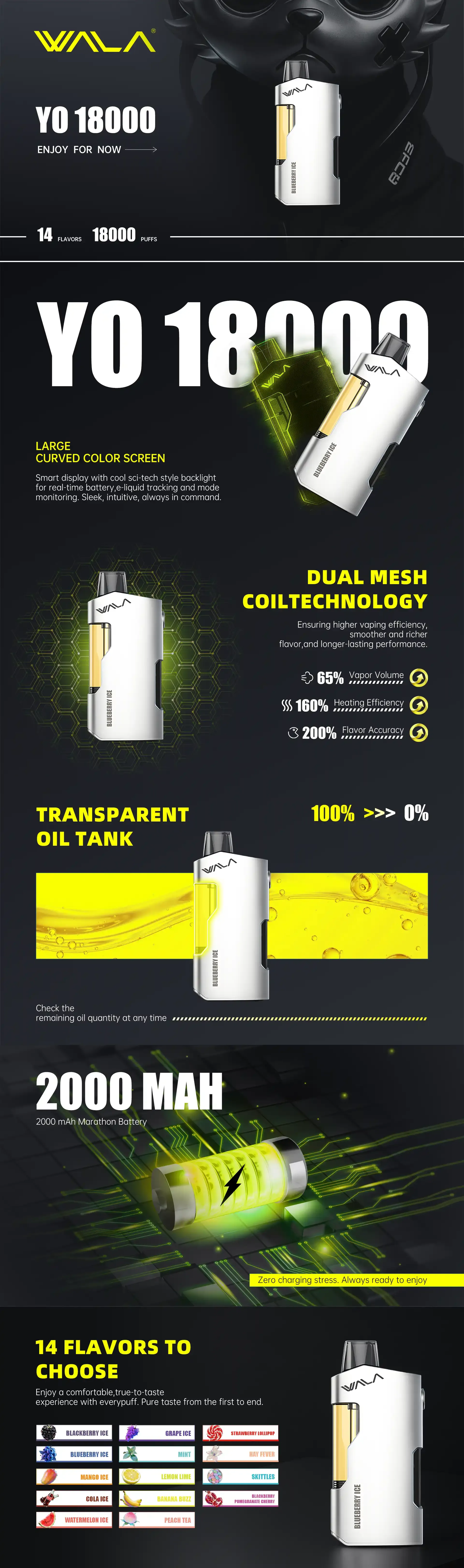 Built with precision craftsmanship and a compact ergonomic design, WALA YO ensures a professional-grade vaping experience. It features advanced Dual Mesh Coil Technology for denser vapor and a richer, more balanced taste with reduced irritation. Enjoy unmatched endurance without the hassle of frequent replacements or charge anxiety – just consistent satisfaction, puff after puff.